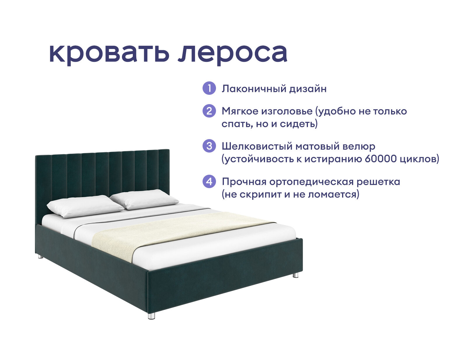 Модель отличается лаконичным изголовьем, которое украшает вертикальная параллельная стёжка. Стильная модель выделяется продуманным дизайном и украсит любой интерьер. Обивка кровати изготовлена из мягкого велюра. Мебельный короб производится из ДСП. В комплект входит ортопедическое металлическое разборное основание.