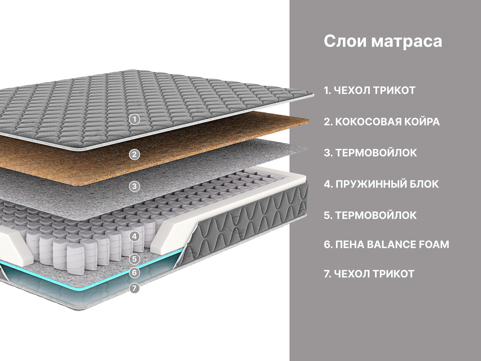 Сторона с уровнем жёсткости выше среднего проложена натуральной койрой кокоса. Материал даёт усиленную поддержку спине и телу.