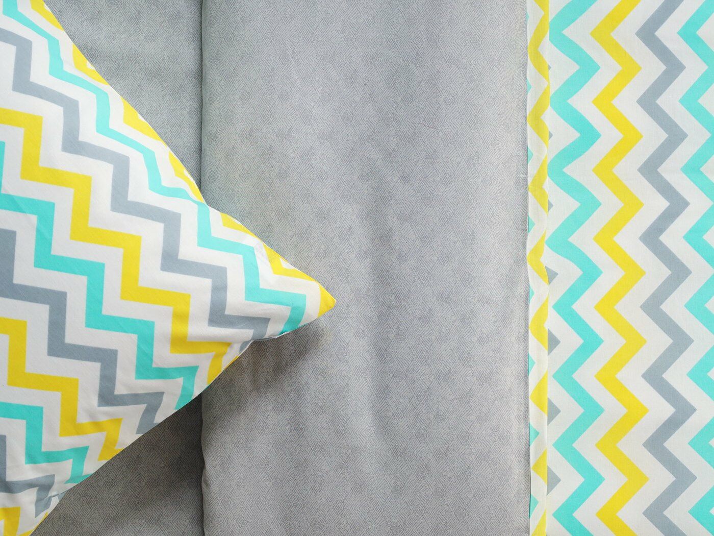Пододеяльник –двусторонний: верх из ткани А (принтованная ткань), обратка из ткани В (однотонная рогожка), с потайной молнией.