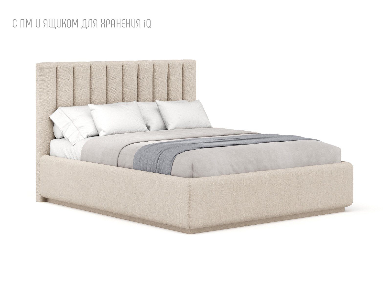 Кровать укомплектована IQ с подъемным механизмом и ящиком для белья без дна (дополнительная платная опция - дно к ящику IQ из HDF (ХДФ). Каркас кровати на цоколе, декоративный чехол на цоколе съёмный. Глубина ящика для белья - 30 см, без ограничения нагрузки на ящик.