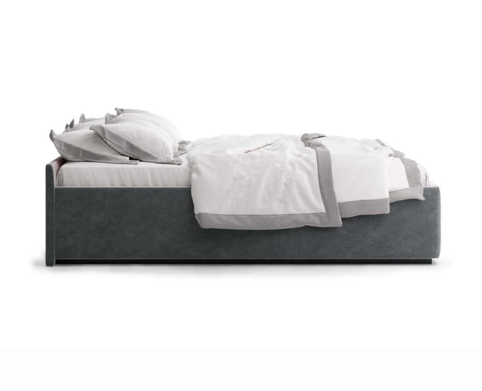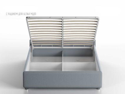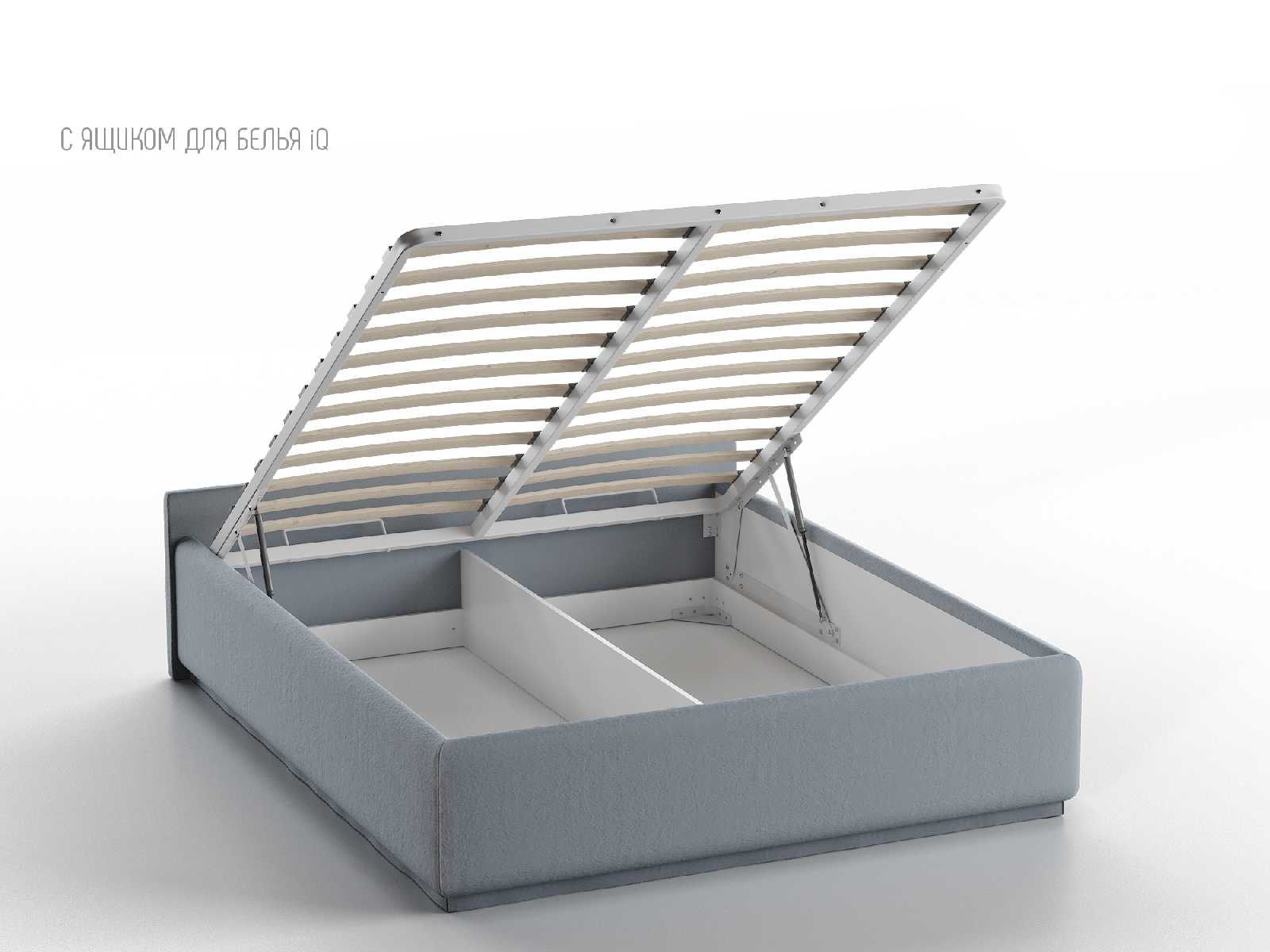 Кровать укомплектована IQ с подъемным механизмом и ящиком для белья без дна (дополнительная платная опция - дно к ящику IQ из HDF (ХДФ). Каркас кровати на цоколе, декоративный чехол на цоколе съёмный. Глубина ящика для белья - 30 см, без ограничения нагрузки на ящик.