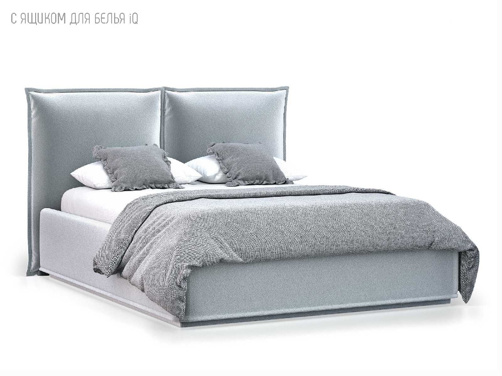 Кровать укомплектована IQ с подъемным механизмом и ящиком для белья без дна (дополнительная платная опция - дно к ящику IQ из HDF (ХДФ). Каркас кровати на цоколе, декоративный чехол на цоколе съёмный. Глубина ящика для белья - 30 см, без ограничения нагрузки на ящик.