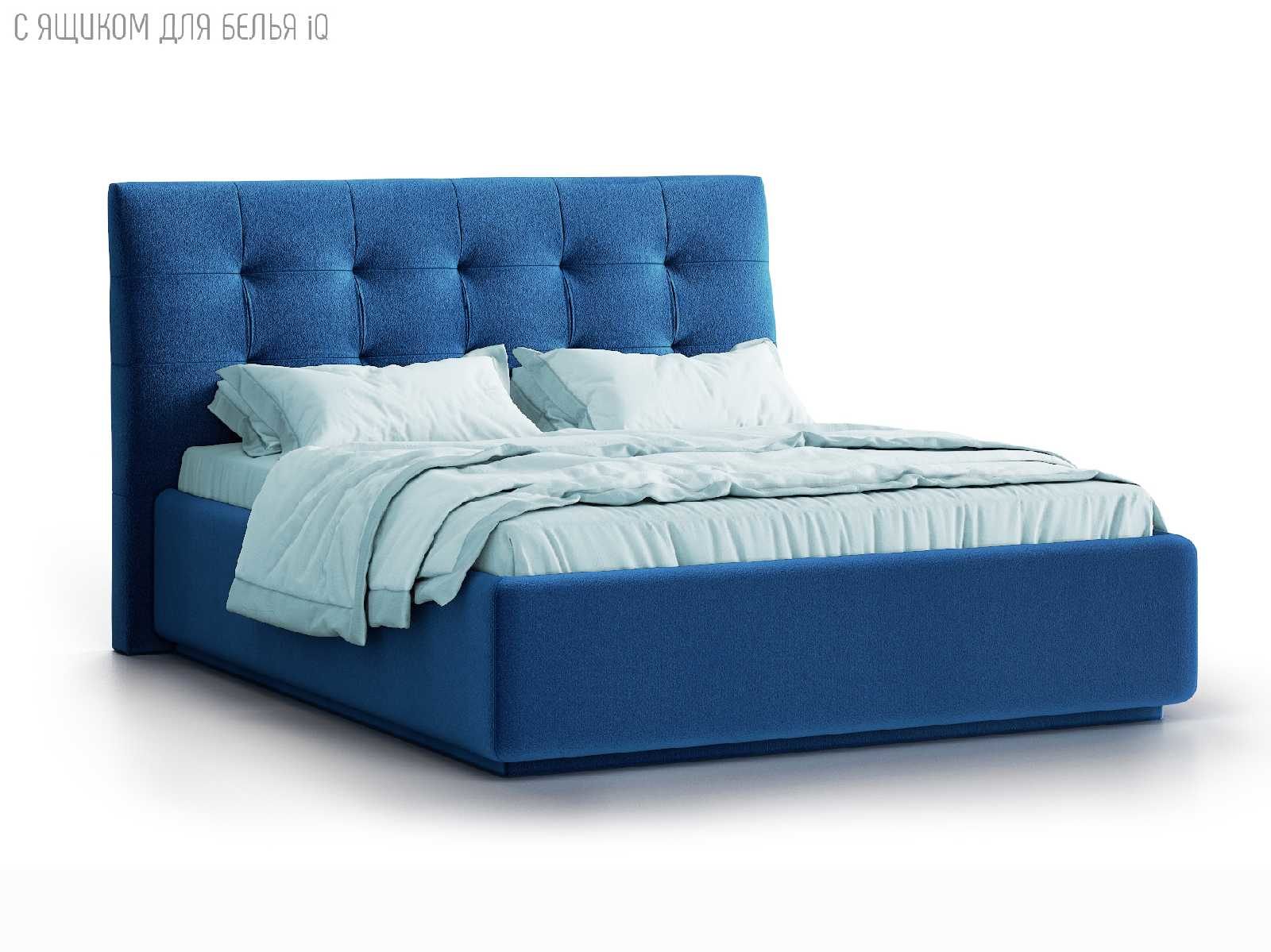 Кровать укомплектована IQ с подъемным механизмом и ящиком для белья без дна (дополнительная платная опция - дно к ящику IQ из HDF (ХДФ). Каркас кровати на цоколе, декоративный чехол на цоколе съёмный. Глубина ящика для белья - 30 см, без ограничения нагрузки на ящик.
