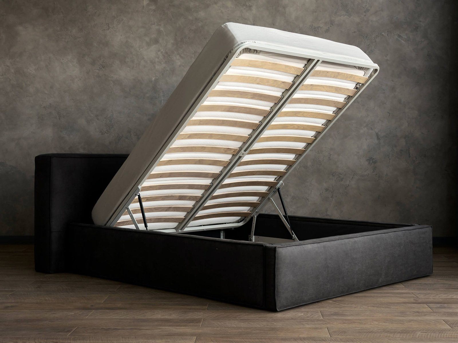 Кровать комплектуется металлическим основанием и подъемным механизмом со вместительным бельевым ящиком. Дно бельевого ящика легко сдвигается для обеспечения уборки под кроватью.
