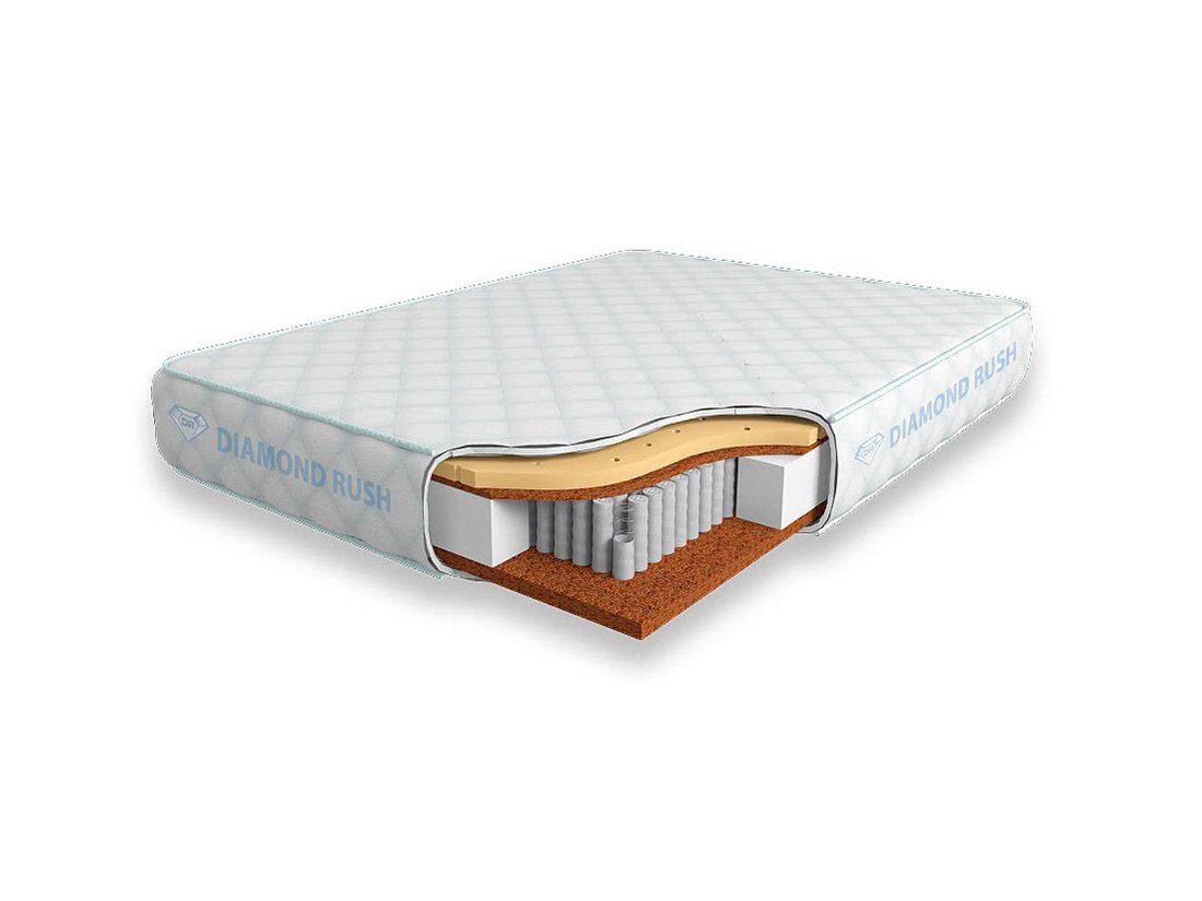 Матрас Diamond Rush Cocos Ergo 1440DR имеет в своей основе независимый пружинный блок 1440, состоящий из пружин диаметром 3-4 см. В качестве настилочных слоев поверх пружинного блока используются листы латексированной кокосовой койры и перфорированного натурального латекса. Матрас является жестким с одной стороны и среднежестким с другой. Вся эта конструкция одета в качественный чехол из трикотажа. Эта ткань безопасна для кожи, не боится стирки и химчистки.