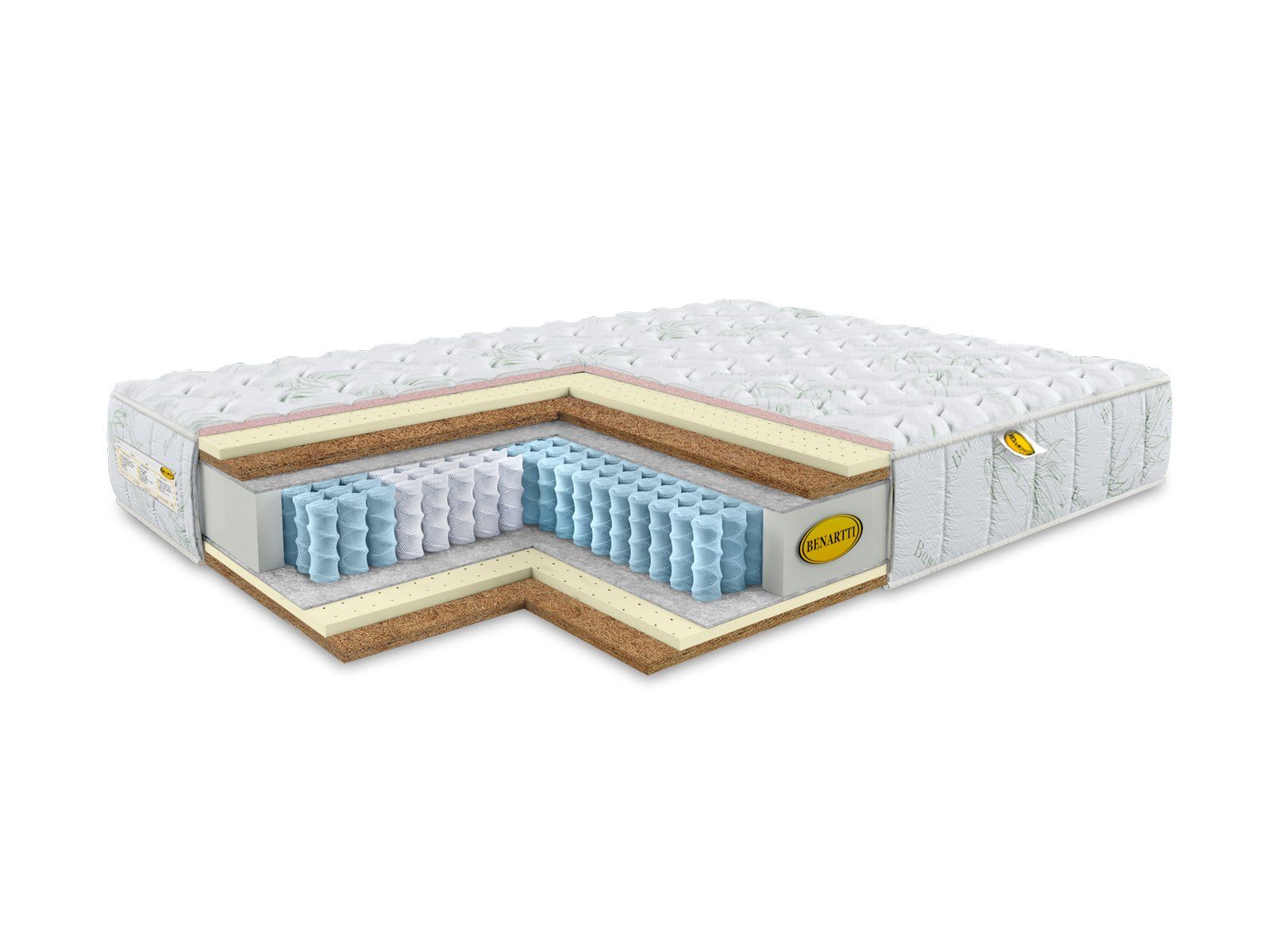 У матраса две стороны жёсткости – средняя и выше среднего. Они обеспечиваются тандемом из койры и латекса, которые расположены сверху и снизу от пружинного блока. Более мягкая сторона представлена у поверхности натуральным латексом, а жёсткая – койрой кокоса. Как правило эти наполнители часто объединены, поскольку они отлично дополняют свойства друг друга. Койра обеспечивает поддержку для спины, а латекс отвечает за комфорт.