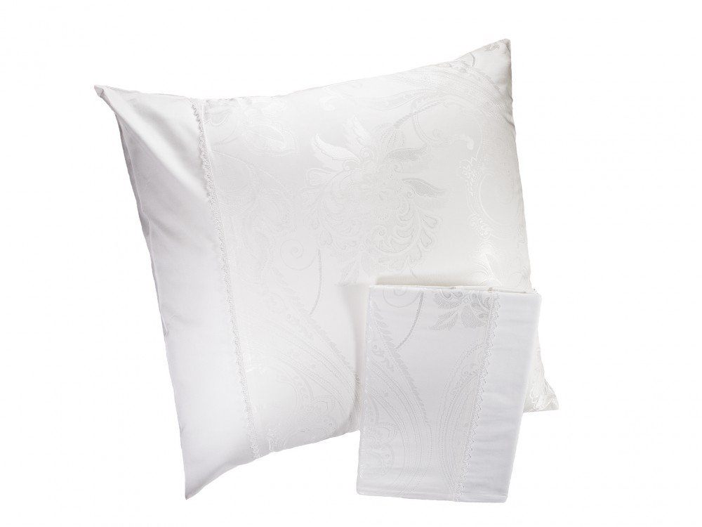 Комплект наволочек 50х70 см 2 шт. или 70х70 см 2 шт. белоснежного цвета. Верх наволочек из жаккардового люкс-сатина (55% вискоза, 45% хлопок), оборотная сторона люкс-сатин (100% хлопок). Отделка - изящное маленькое кружево. Наволочки закрываются на клапан. В комплекте 2 наволочки; упакованы в пакет из пвх с фирменным логотипом.