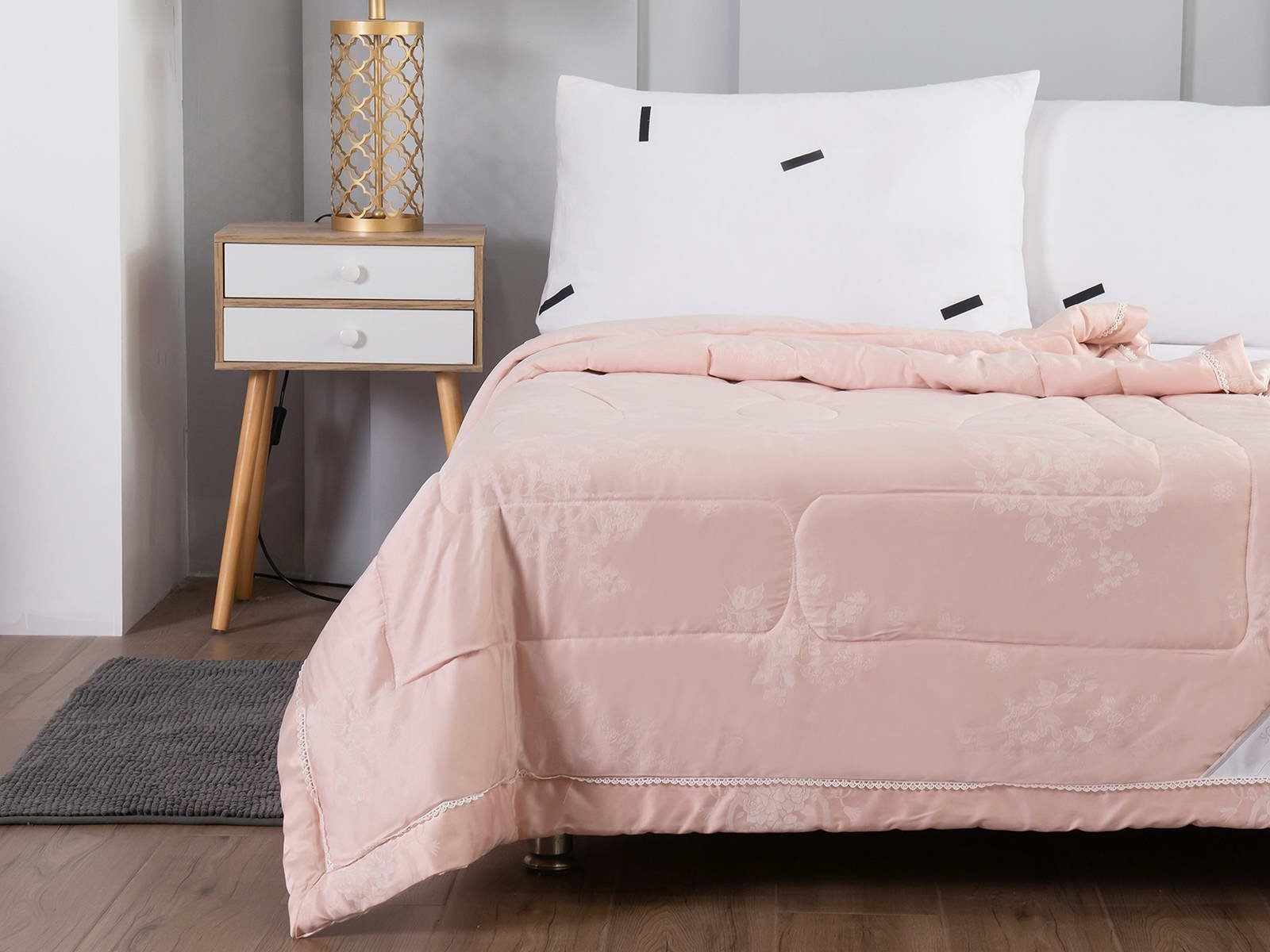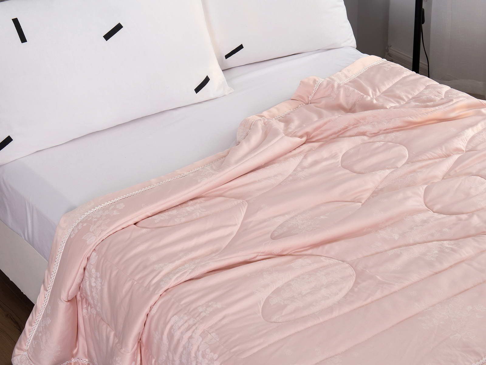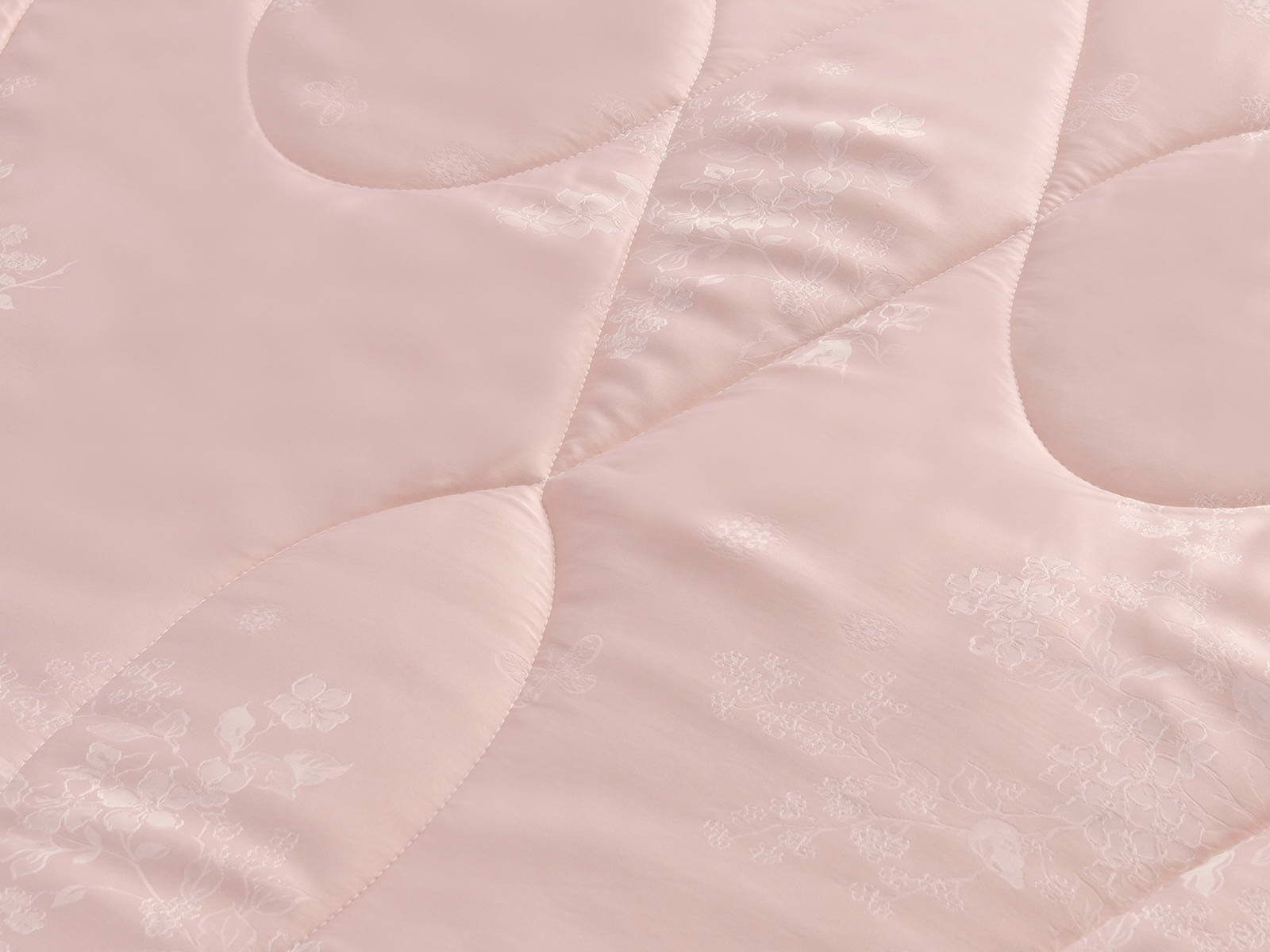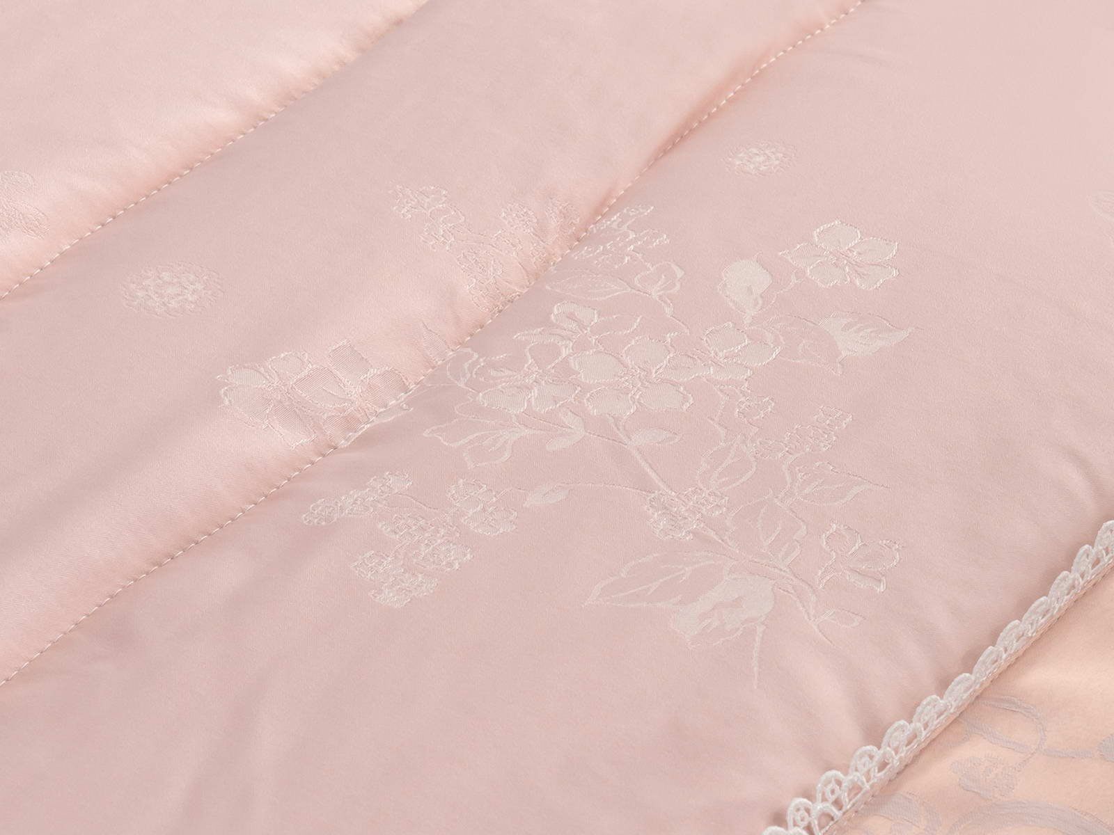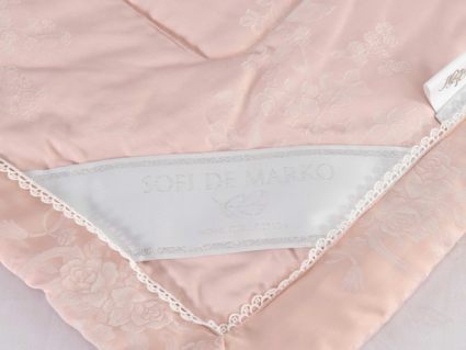 Одеяло представлено в модных цветах этого сезона: пудра, персик, крем, серый, карамель. Такие оттенки придадут нотки изысканности и утонченности вашей спальне. Изделие украшает декоративная стежка, создающая на одеяле прямые, изогнутые линии и окружности. С помощью специального станка на ткань нанесен уникальный повторяющийся рисунок в винтажном стиле. Вы можете выбрать узор на свой вкус: небольшой лавровый венок, венчающий корону, или одну из цветочных композиций среднего размера. По широкому канту в тон изделию проходит деликатная полоска светлого кружева.