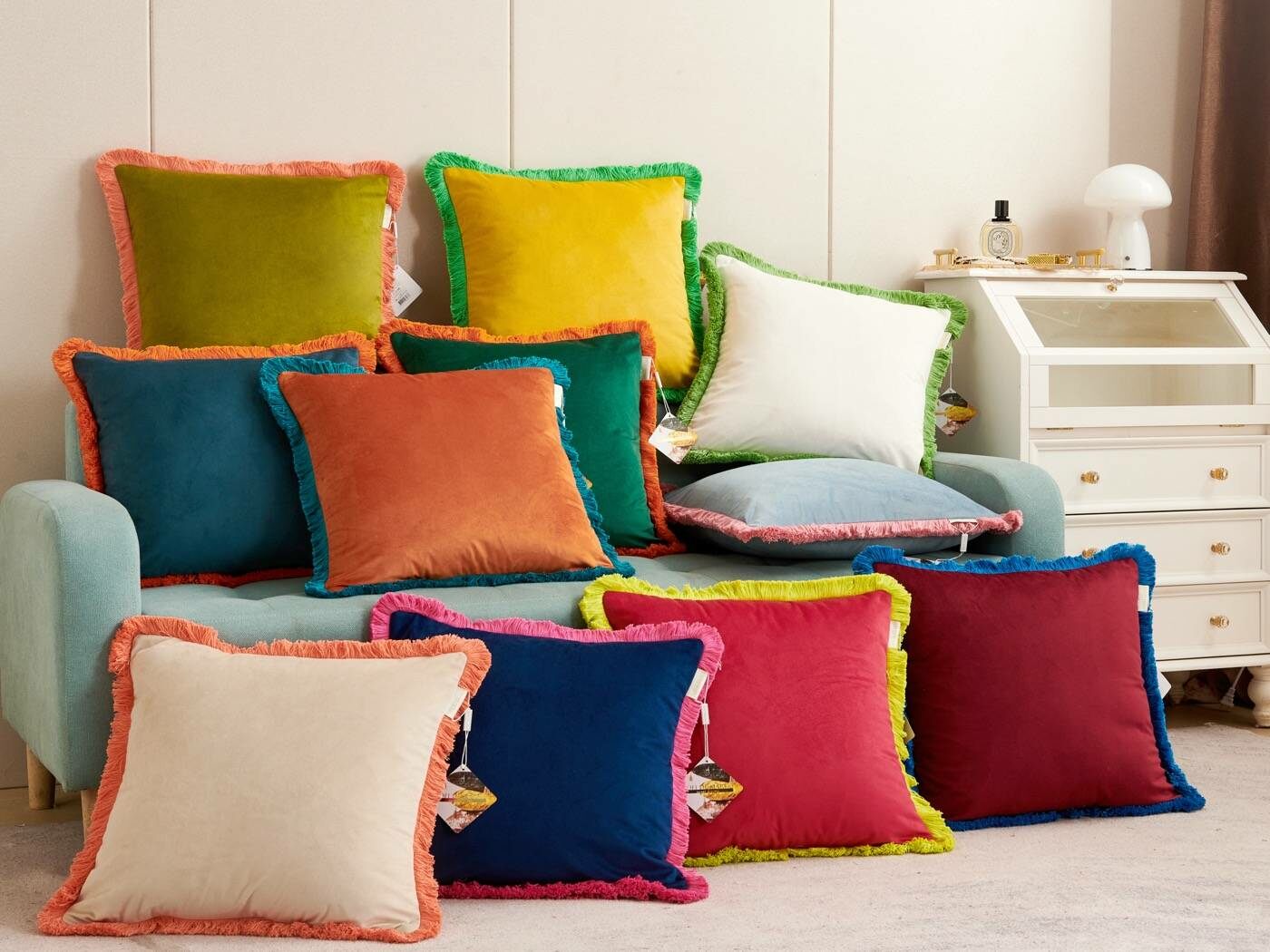 Коллекция пошита из мягкого и приятного на ощупь велюра плотностью 250г/м2. Наволочки с контрастной хлопковой бахромой добавят ярких акцентов и жизнерадостности в ваш интерьер. Большой выбор расцветок поможет расставить цветовой акцент и подчеркнет индивидуальность Вашей гостиной.