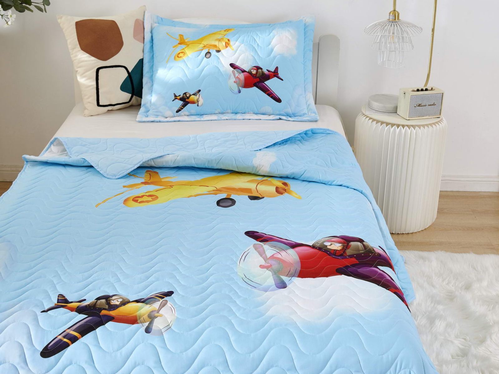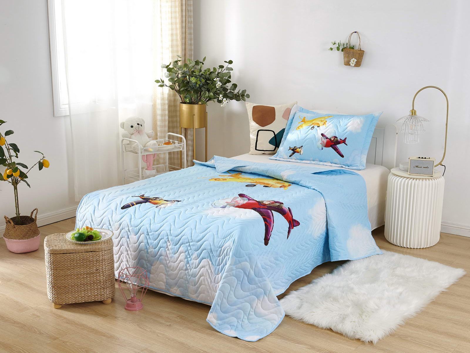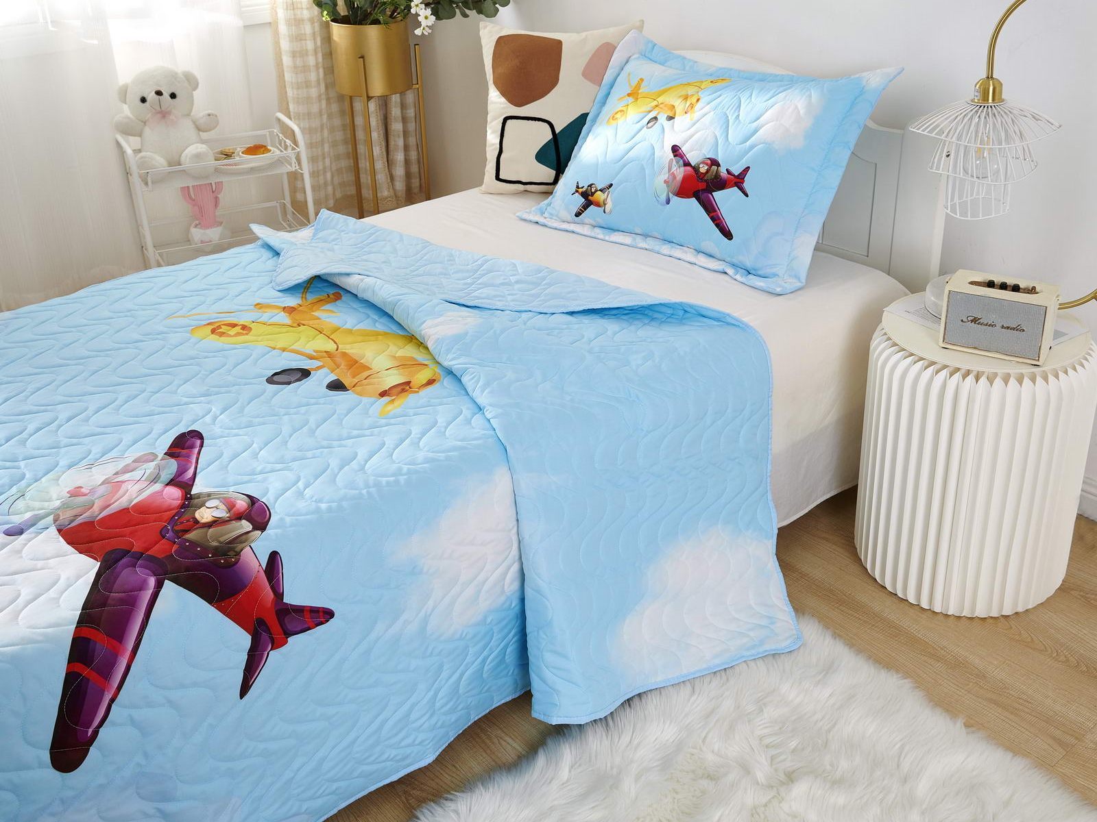 Детские покрывала - это особая забота об уюте и комфорте ребенка. Красивое, стеганое покрывало коллекции «Sunny day» придаст любой детской спальне яркую индивидуальность. Волнистые стежки делают изящные покрывала еще более выразительными и изящными. К ним в комплекте идут наволочки, у них есть интересная особенность, которая непременно понравится ребенку– небольшие ушки.